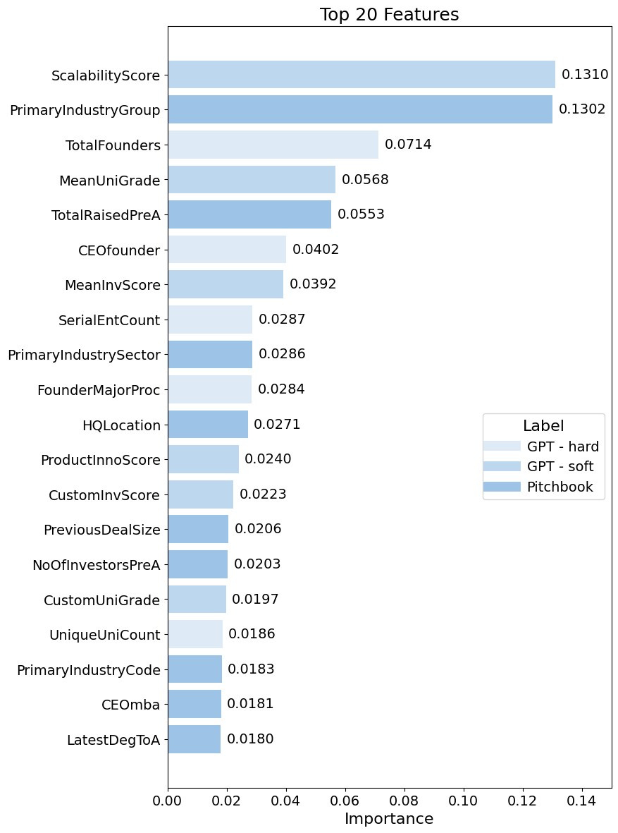 I used GPT-4 to retrieve ‘hard’ information and (inspired by the paper of Dominik Dellerman, who employed human experts in his Hybrid Intelligence Model) to get ‘soft’ human expert-like assessments. I retrieved from GPT information on founders’ education (degrees, majors, universities), if they were serial entrepreneurs, on business model characteristics and products. I also asked GPT-4 to assess the quality of founders’ education, scalability of a business model, product innovativeness and quality of seed investors. Features generated with GPT-4 had an aggregated importance of 0.49 (incl. 0.29 for ‘soft’ information), while features generated based on Pitchbook information had an aggregated importance of 0.51. This means that GPT-generated features were almost equally useful for predicting the success of startup companies as data from Pitchbook.