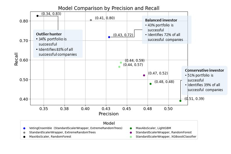 I trained several models, and if they were investors, they would build portfolios consisting of between 34 and 51% of successful companies (precision), identifying between 39 and 83% of all successful companies (recall) in a data set. There is a trade-off between the two, and the decision of how to tune a model or which model to choose should be based on a use case and your risk appetite. However, given that VC investing is an outlier hunting, I’d opt for StandardScalerWrapper, ExtreemeRandomTrees, which would identify 80% of all successful companies and build a portfolio with 41% of successful companies.